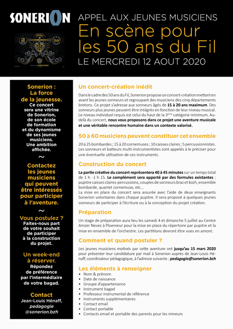 Concernant notre participation à la 50ème édition du Festival Interceltique de Lorient et plus généralement notre étroite et historique contribution au FIL, elle restera indéfectible en toutes circonstances. Si la 50ème édition du festival est maintenue, en accord avec les responsables du festival, nous travaillerons avec les groupes pour proposer un spectacle à la hauteur des attentes du public, en lieu et place du Championnat National des bagadoù programmé le samedi 8 août 2020 au stade du Moustoir. Cette préparation se fera en lien avec le Festival Interceltique de Lorient.