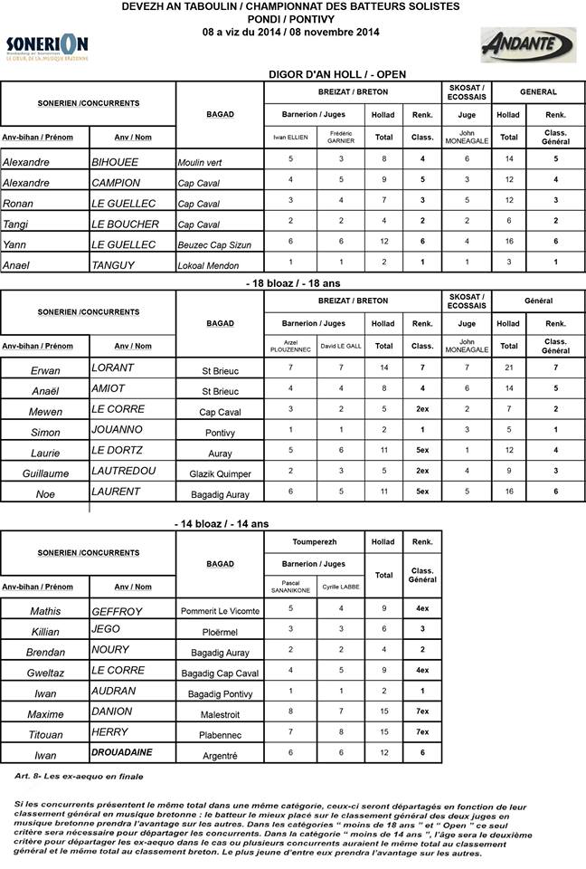 Dans le cadre de la formation des sonneurs les concours pour solistes sont organisés par catégorie d’âge et par styles de musique : bretonne et écossaise.