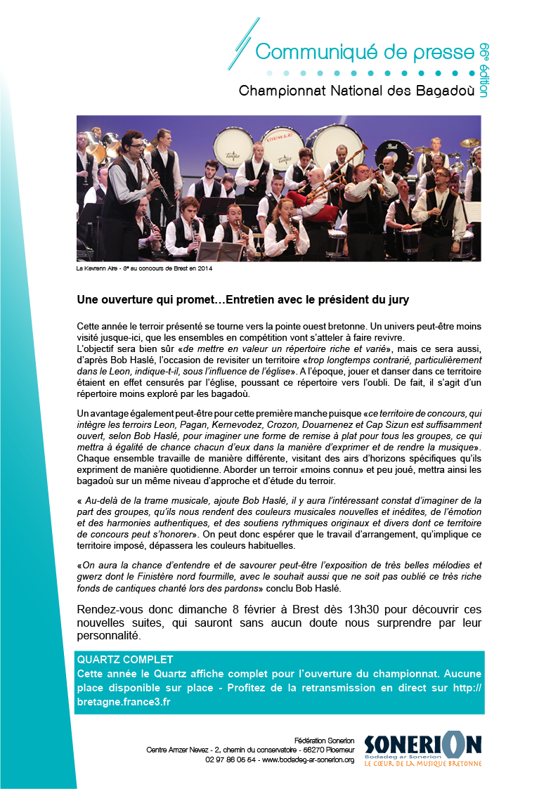 Un avantage également peut-être pour cette première manche puisque «ce territoire de concours, qui intègre les terroirs Leon, Pagan, Kernevodez, Crozon, Douarnenez et Cap Sizun est suffisamment ouvert, selon Bob Haslé, pour imaginer une forme de remise à plat pour tous les groupes, ce qui mettra à égalité de chance chacun d’eux dans la manière d’exprimer et de rendre la musique». Chaque ensemble travaille de manière différente, visitant des airs d’horizons spécifiques qu’ils expriment de manière quotidienne. Aborder un terroir «moins connu» et peu joué, mettra ainsi les bagadoù sur un même niveau d’approche et d’étude du terroir.