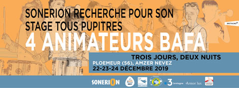 Pour encadrer les jeunes participants à son stage tous pupitres (bombarde, cornemuse, caisse claire, binioù) qui aura lieu au Centre Amzer Nevez de Ploemeur (56), les 22-23-24 décembre 2019 (trois jours, deux nuits), Sonerion recherche quatre animateurs titulaires du BAFA (Brevet d’Aptitude aux Fonctions d’Animateur).