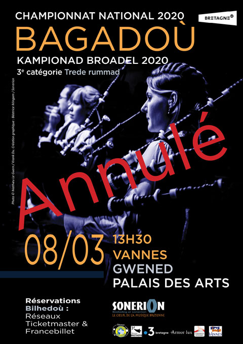 Les annonces faites ensuite au niveau de l’Etat nous ont conduit également à prendre très rapidement la décision d’annuler la 1ère manche du Championnat National des bagadoù de 2nde catégorie qui devait être présentée à Saint-Brieuc le 22 mars.