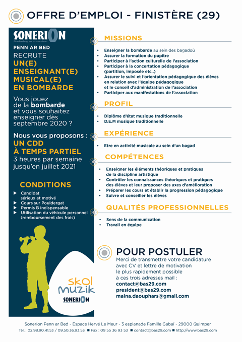 Sonerion 29 recrute un(e) enseignant(e) musical(e) en bombarde